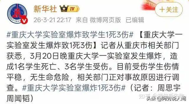3月20日晚7點,重慶大學科學城校區(qū)的一個實驗室突然爆炸。當時有四名學生在里面做實驗,爆炸發(fā)生后一名學生當場死亡三人受傷,現(xiàn)場儀器碎了一地,地上還有血跡。