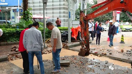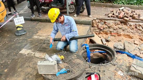 為了防止爆炸,消防部門在現(xiàn)場(chǎng)處置時(shí)使用了大量的水,而這些水積滿了現(xiàn)場(chǎng)開(kāi)挖的土溝,于是,施工方準(zhǔn)備利用窨井進(jìn)行排水,看到這種情況,現(xiàn)場(chǎng)搶修人員趕緊喊停。